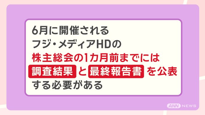 6月に開催される、フジ・メディア・ホールディングスの株主総会の1カ月前までには、調査結果と最終報告書を公表する必要がある。