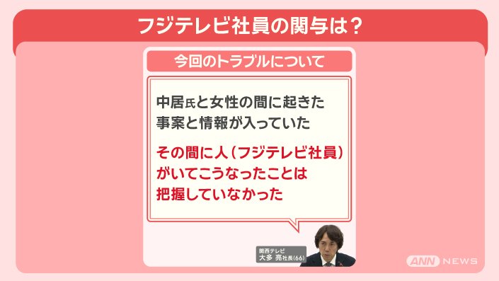 「中居氏と女性の間に起きた事案と、情報が入っていた。その間に人(フジテレビ社員)がいてこうなったことは、把握していなかった」と答えました。