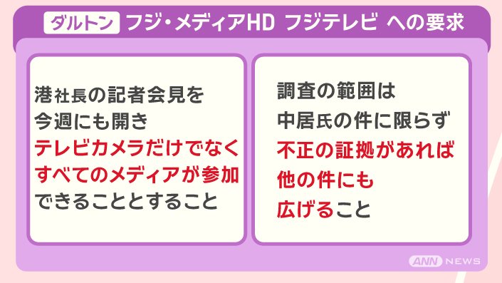 他にも、ダルトン・インベストメンツは、フジ・メディア・ホールディングスとフジテレビに、こうした要求をしています。