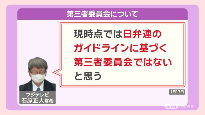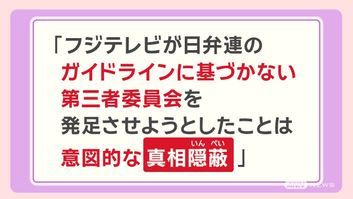 「フジテレビが、日弁連のガイドラインに基づかない第三者委員会を発足させようとしたことは、意図的な真相隠蔽」だとしています。