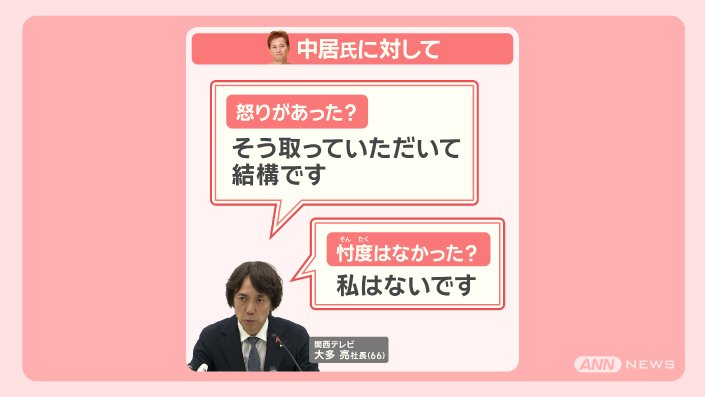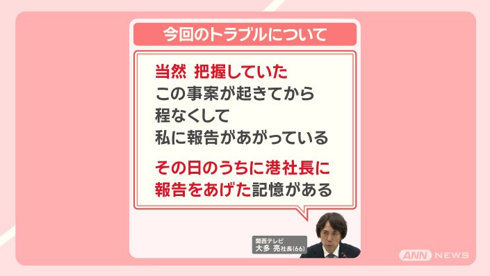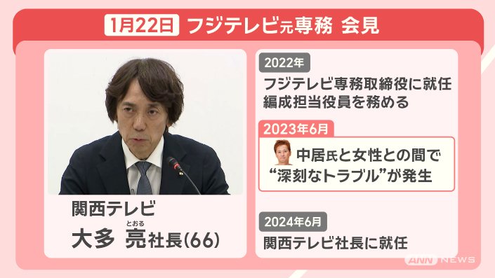 タレントの中居正広さんの女性トラブルについて、トラブルがあった当時フジテレビの専務だった、関西テレビの大多亮社長が、1月22日に会見しました。