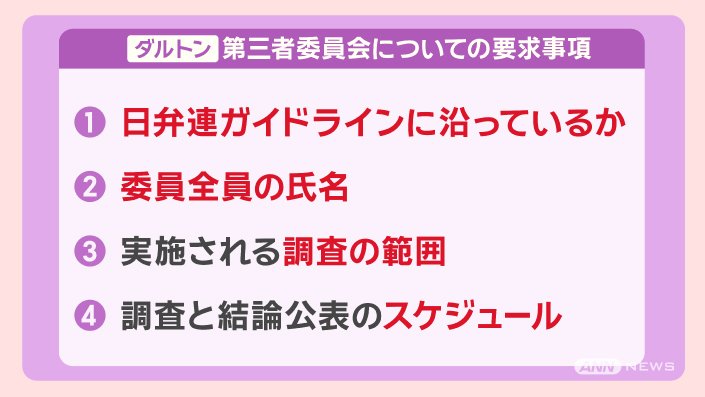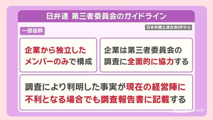 「現時点では、日弁連(日本弁護士連合会)のガイドラインに基づく第三者委員会ではないと思う」としていました。