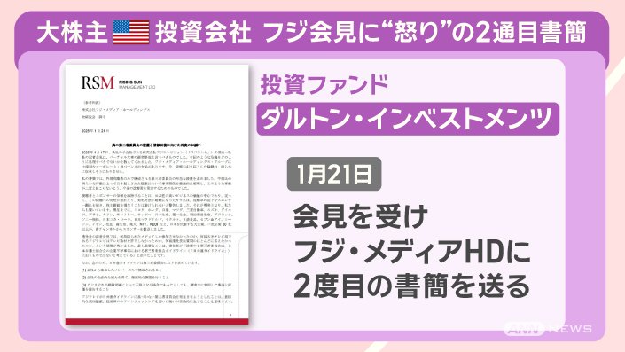 大株主である投資ファンド、ダルトン・インベストメンツが、フジテレビの港社長の会見を受けて、1月21日、フジ・メディア・ホールディングスに2度目の書簡を送りました。