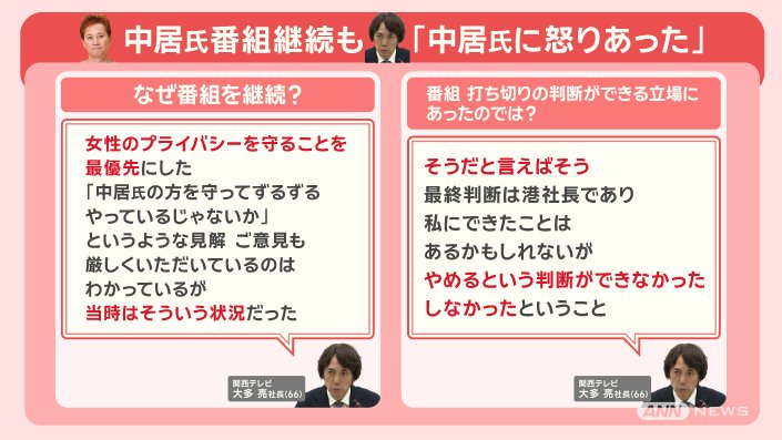 「女性のプライバシーを守ることを最優先にした。『中居氏の方を守って、ずるずるやっているじゃないか』というような見解・ご意見も厳しくいただいているのはわかっているが、当時はそういう状況だった」ということです。
