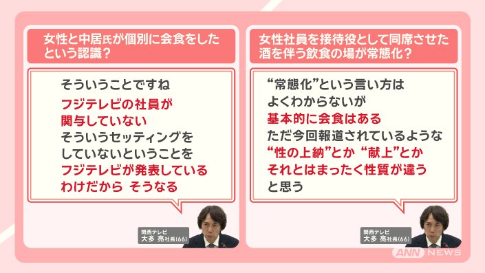 「『常態化』という言い方はよくわからないが、基本的に会食はある。ただ、今回報道されているような、『性の上納』とか 『献上』とか、それとはまったく性質が違うと思う」としています。