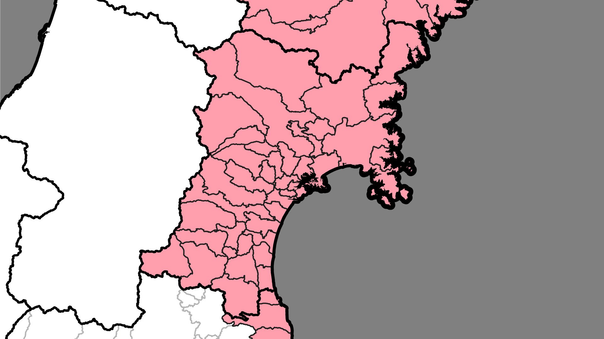 石巻市、岩沼市、大河原町、大崎市、大郷町、大衡村、女川町、角田市、加美町、川崎町、栗原市、気仙沼市、蔵王町、塩竈市、色麻町、七ヶ宿町、七ヶ浜町、柴田町、白石市、仙台市、大和町、多賀城市、富谷市、登米市、名取市、東松島市、松島町、丸森町、美里町、南三陸町、村田町、山元町、利府町、涌谷町、亘理町