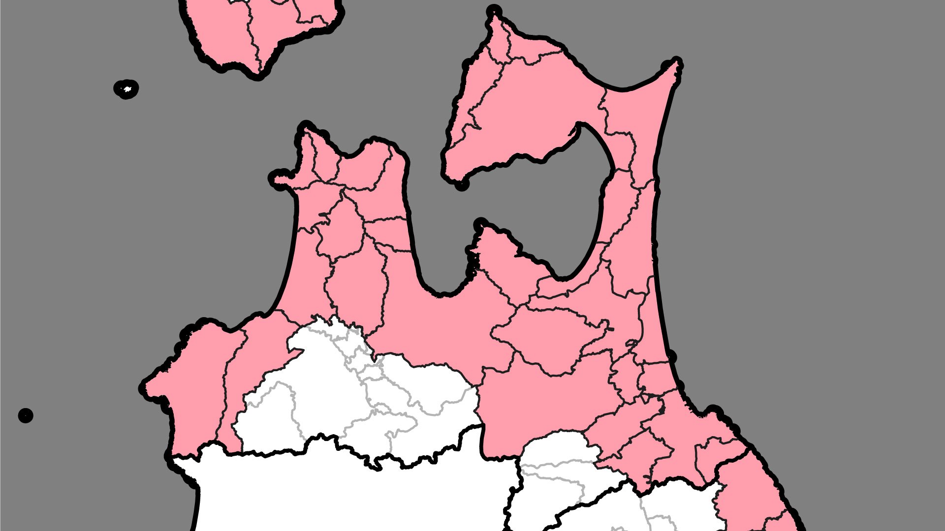 青森市、鰺ヶ沢町、今別町、おいらせ町、大間町、風間浦村、五所川原市、五戸町、佐井村、七戸町、外ヶ浜町、つがる市、東北町、十和田市、中泊町、南部町、野辺地町、階上町、八戸市、東通村、平内町、深浦町、三沢市、むつ市、横浜町、蓬田村、六戸町、六ヶ所村