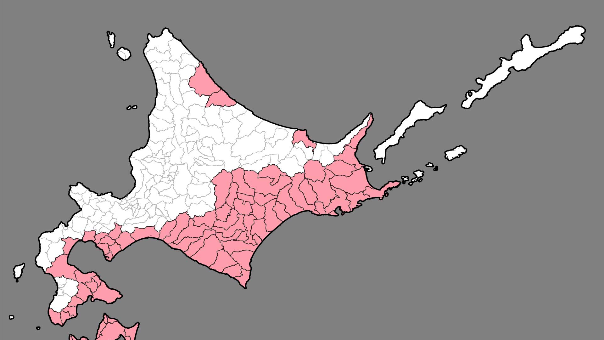 足寄町、厚岸町、厚真町、網走市、池田町、浦河町、浦幌町、枝幸町、えりも町、雄武町、長万部町、音更町、帯広市、上士幌町、木古内町、釧路市、釧路町、様似町、更別村、鹿追町、鹿部町、標茶町、標津町、士幌町、清水町、白老町、白糠町、知内町、新得町、新ひだか町、壮瞥町、大樹町、伊達市、鶴居村、弟子屈町、洞爺湖町、苫小牧市、豊浦町、豊頃町、中札内村、中標津町、七飯町、新冠町、根室市、登別市、函館市、浜中町、日高町、平取町、広尾町、福島町、別海町、北斗市、本別町、幕別町、松前町、むかわ町、室蘭市、芽室町、森町、八雲町、羅臼町、陸別町