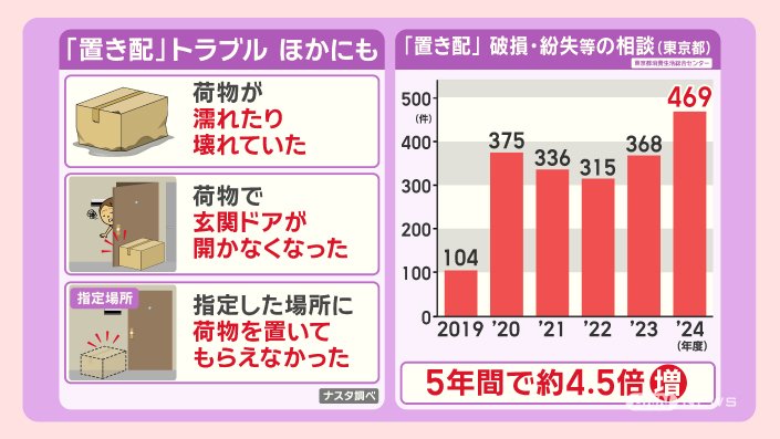 東京都だけで、『置き配』の破損や紛失などの相談件数は、2024年度は469件と、5年間で約4.5倍に増えています。