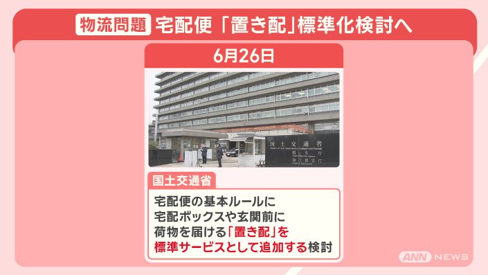 6月26日、国土交通省は、宅配便の基本ルールに、宅配ボックスや玄関前に荷物を届ける『置き配』を、標準サービスとして追加する検討を始めました。