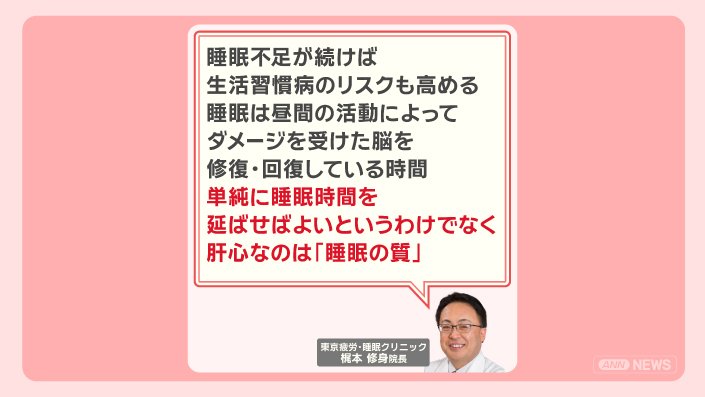 「睡眠不足が続けば、生活習慣病のリスクも高める。睡眠は、昼間の活動によってダメージを受けた脳を修復・回復している時間。単純に睡眠時間を延ばせばよいというわけでなく、肝心なのは『睡眠の質』」