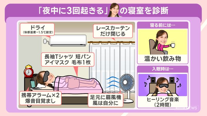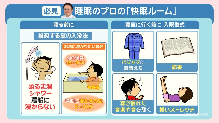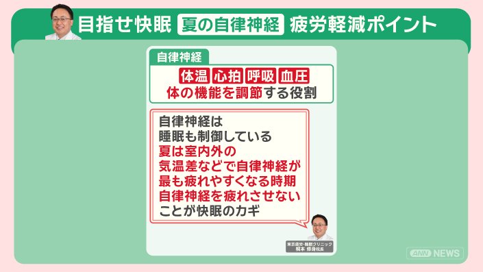 「自律神経は睡眠も制御している。夏は室内外の気温差などで、自律神経が最も疲れやすくなる時期。自律神経を疲れさせないことが、快眠のカギ」ということです。