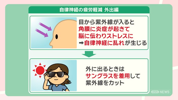目から紫外線が入ると、角膜に炎症が起きて、それが脳に伝わりストレスとなり、自律神経に乱れが生じます。