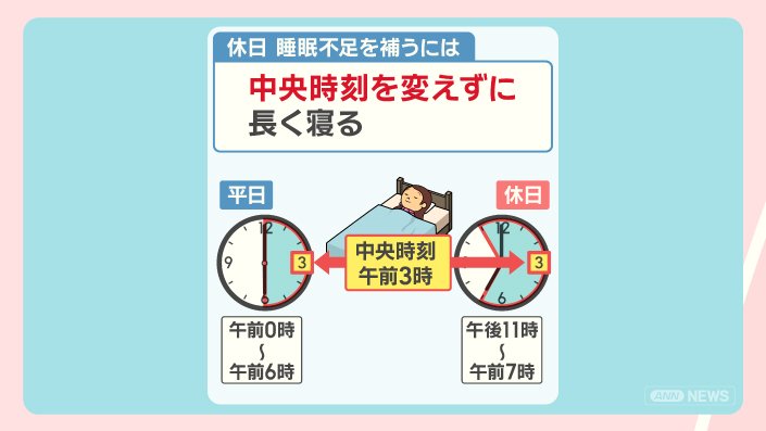 そして、休日に平日の睡眠不足を補うには、『中央時刻を変えずに長く寝る』です。