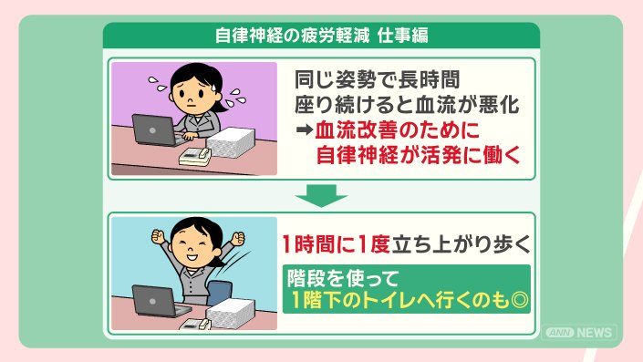 同じ姿勢で長時間座り続けると、血流が悪化して、血流改善のために自律神経が活発に働き、負担となります。