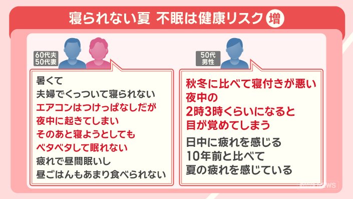 「秋冬に比べて、寝付きが悪い。夜中の2時3時くらいになると、目が覚めてしまう。日中に疲れを感じる。10年前と比べて、夏の疲れを感じている」