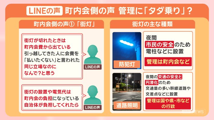 「街灯が切れたときは、町内会費から出ている。引っ越してきた人に会費を『払いたくない』と言われた。同じ立場なのになんで?と思う」