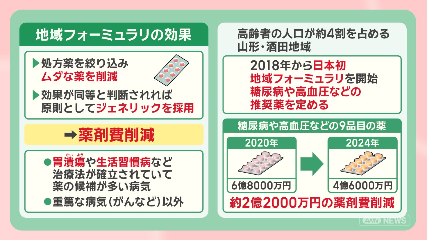 その結果、糖尿病や高血圧の薬など9品目の薬の薬剤費が、2020年の6億8000万円から、2024年には4億6000万円となり、約2億2000万円削減されました。