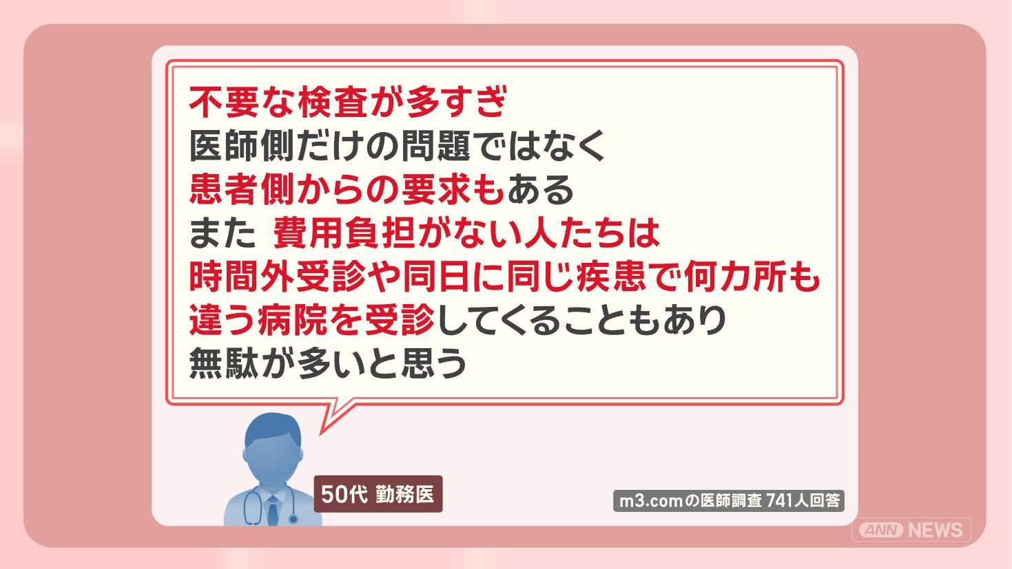「不要な検査が多すぎ。医師側だけの問題ではなく、患者側からの要求もある。また、費用負担がない人たちは、時間外受診や同日に同じ疾患で何カ所も違う病院を受診してくることもあり、無駄が多いと思う」