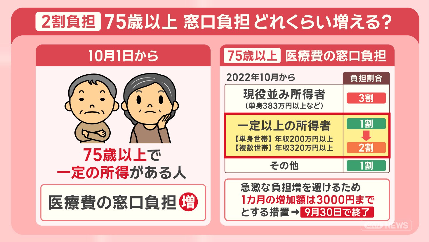 その際、急激な負担の増加を避けるため、1カ月の増加額は3000円までとする措置がとられましたが、この措置が9月30日で終了しました。