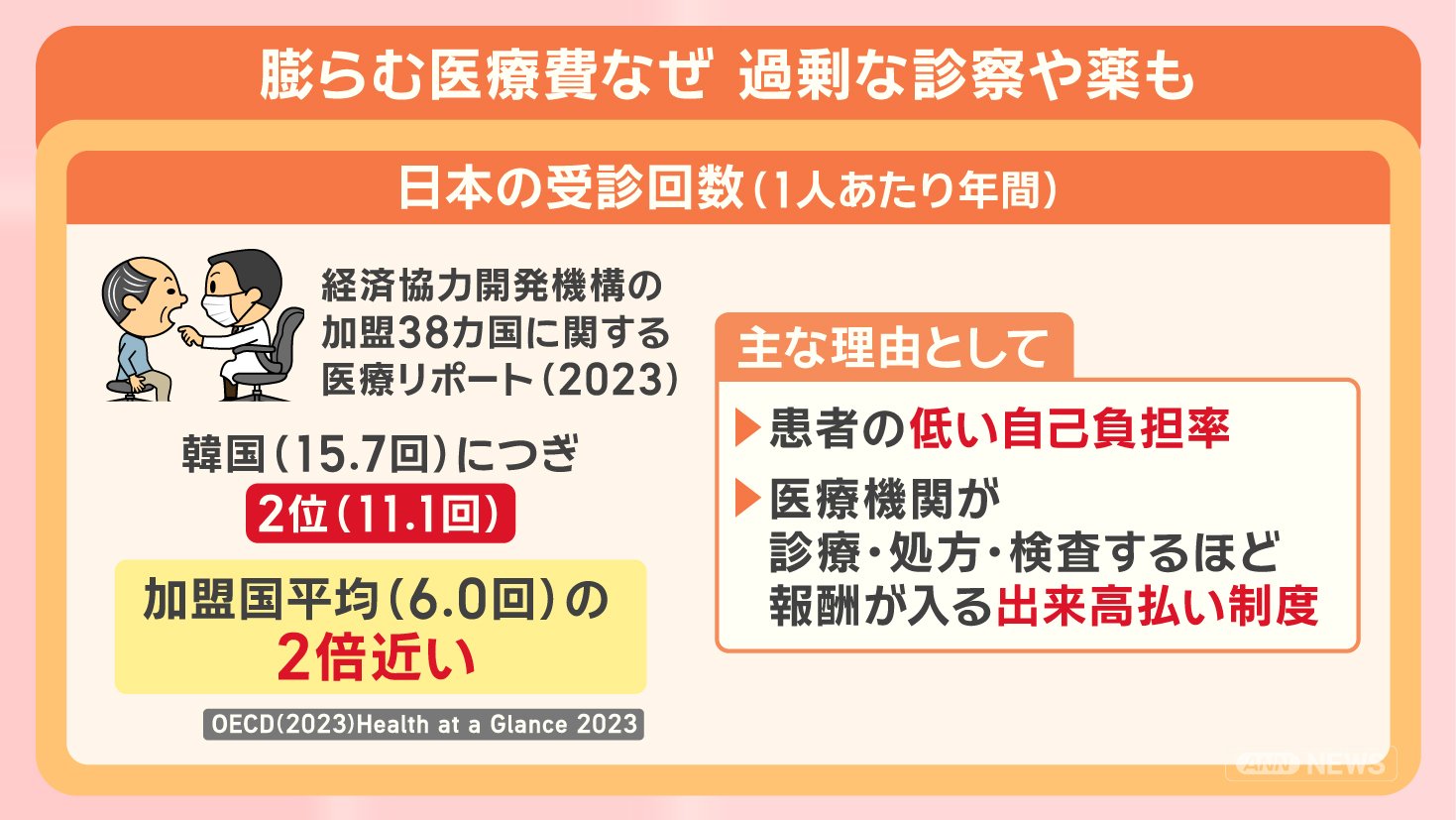 日本の1人あたりの受診回数は、経済協力開発機構(OECD)の加盟38カ国に関する医療リポートで、韓国の15.7回につぎ、2位で11.1回です。
