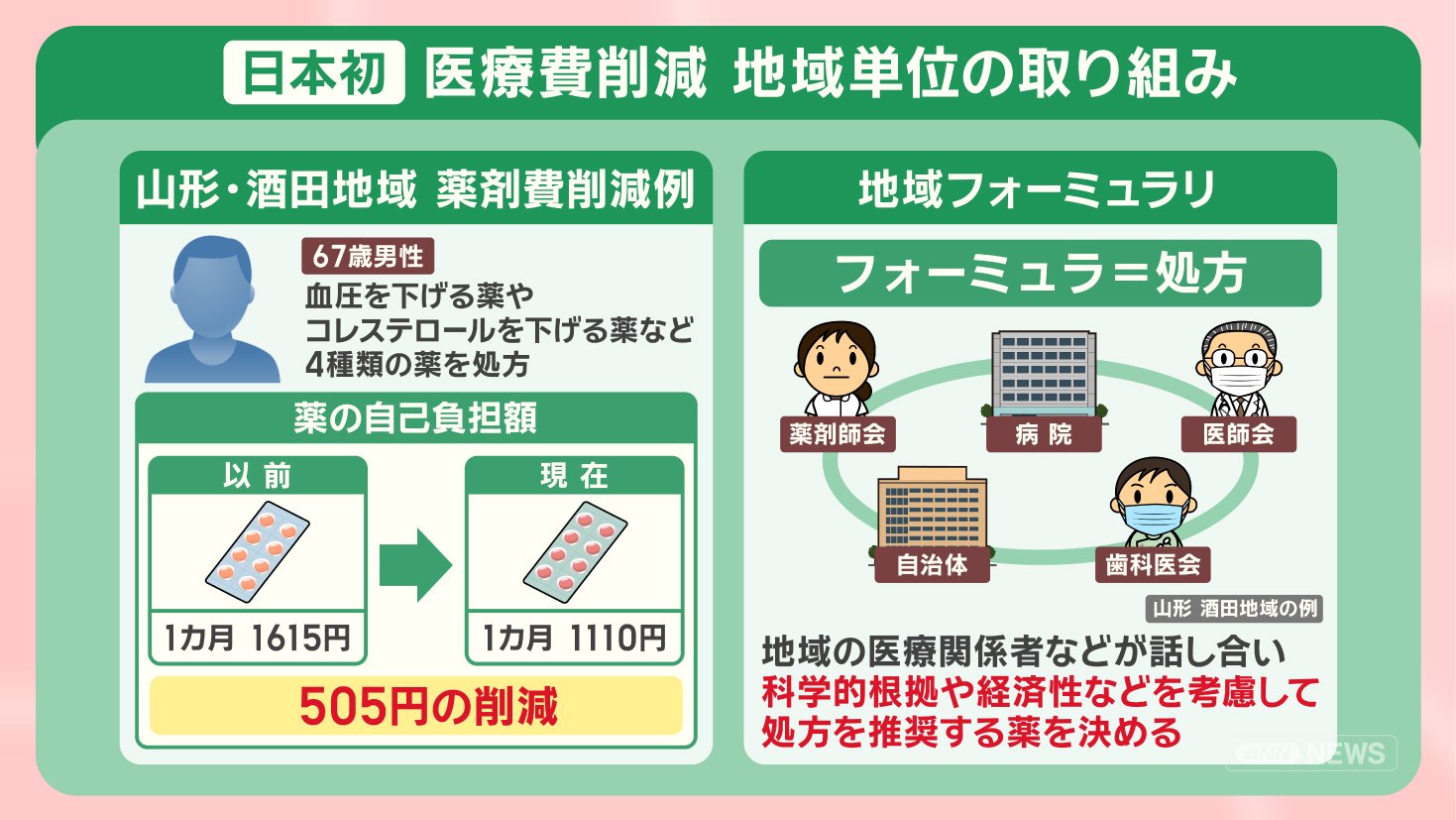 高齢者の人口が全体の4割を占める山形の酒田地域では、2018年に日本で初めて、この地域フォーミュラリを始め、糖尿病や高血圧などの推奨薬を定めました。
