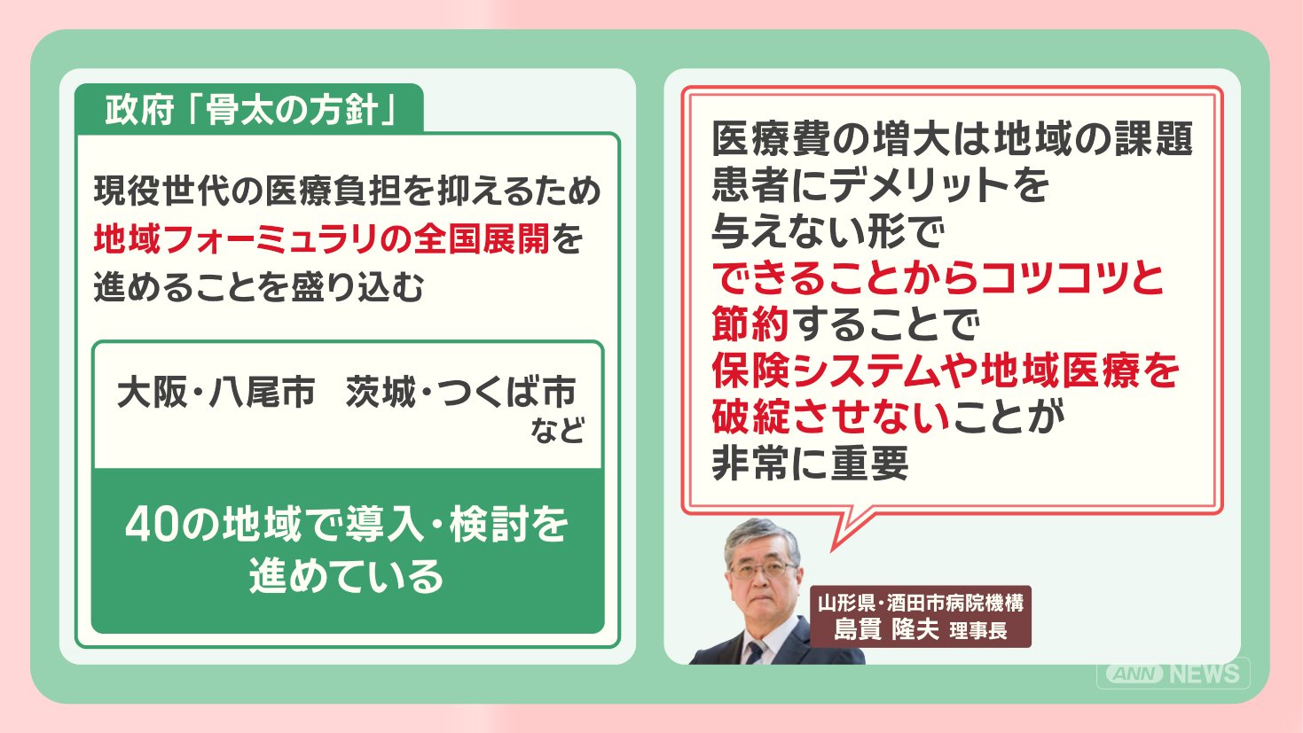 政府は、現役世代の医療負担を抑えるため、2025年の『骨太の方針』に、地域フォーミュラリの全国展開を進めることを盛り込んでいて、現在、大阪・八尾市、茨城・つくば市など40の地域で導入、導入に向けた検討を進めています。