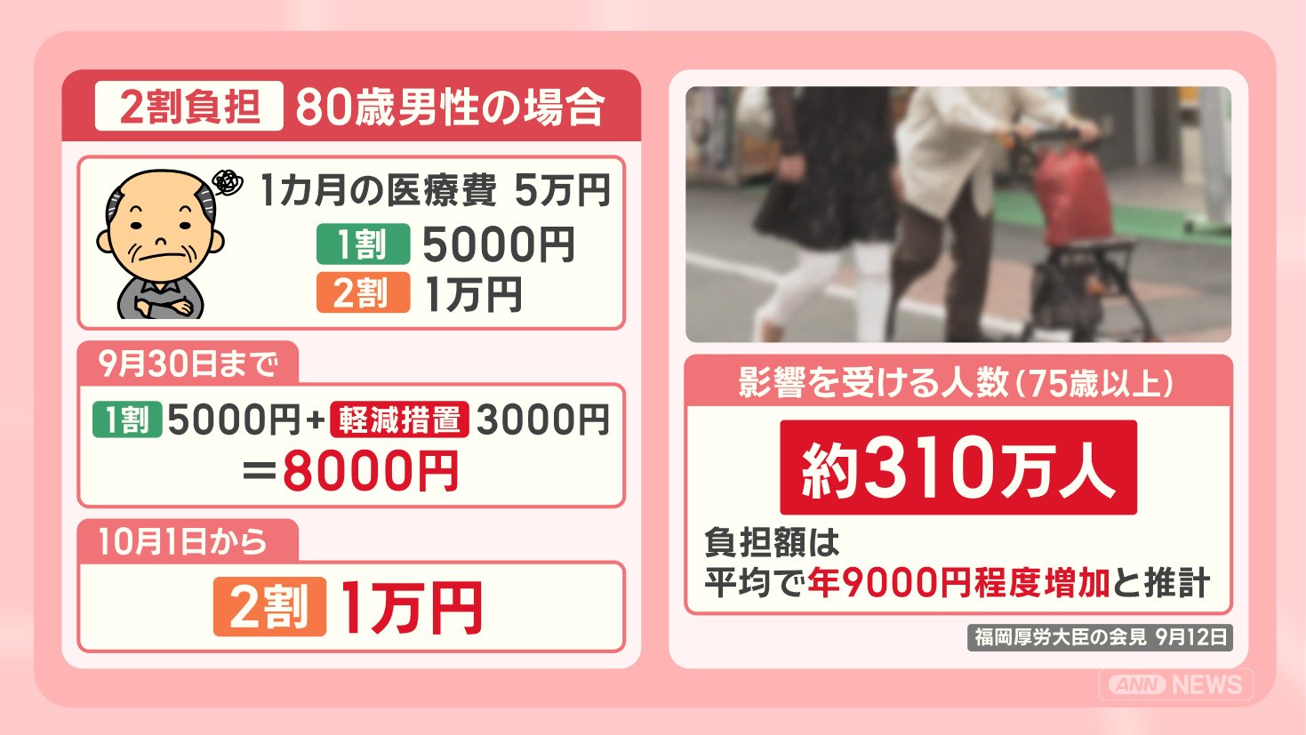 1カ月の医療費が5万円の80歳男性の場合、1割負担だと5000円ですが、2割負担だと1万円です。
