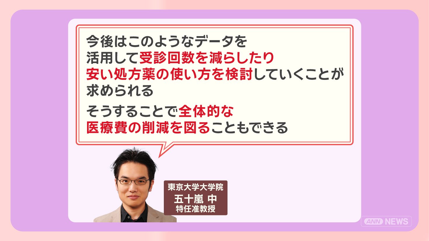 「今後はこのようなデータを活用して受診回数を減らしたり、安い処方薬の使い方を検討していくことが求められる。そうすることで、全体的な医療費の削減を図ることもできる」ということです。