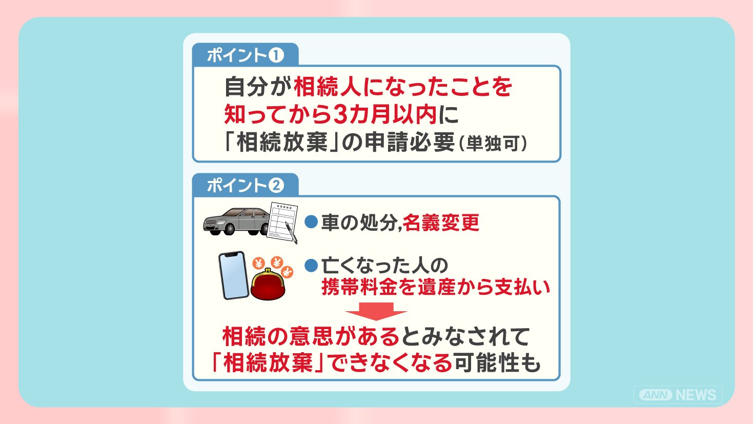 1つ目は、自分が相続人になったことを知ってから、3カ月以内に、『相続放棄』の申請が必要です。