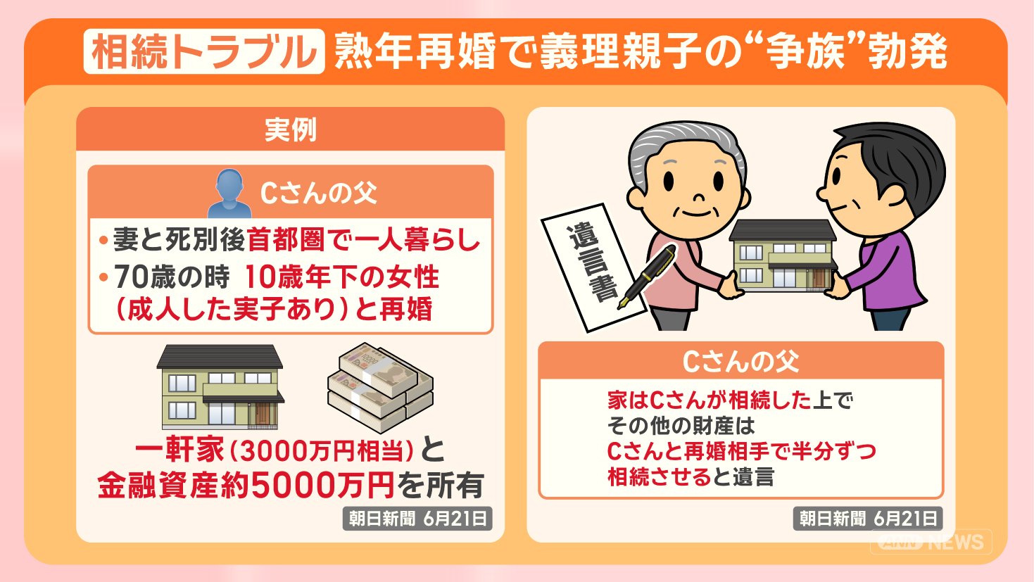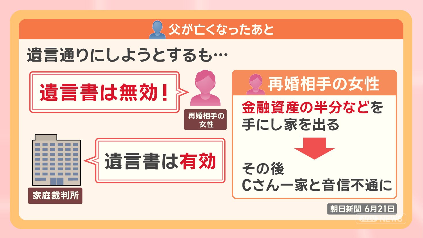 Cさんの父が亡くなったあと、Cさんは、遺言通りにしようとしましたが、再婚相手の女性が、「遺言書は無効」と主張。