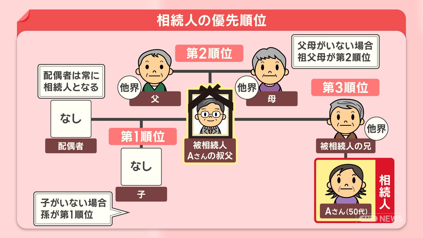 Aさんの叔父である被相続人には、相続人となる配偶者がいません。