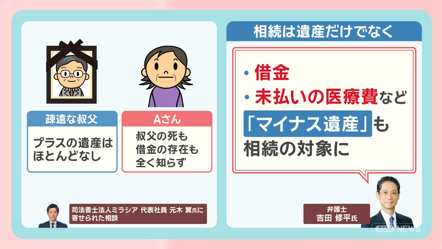 「相続は、(プラスの)遺産だけでなく、借金や未払いの医療費など『マイナス遺産』も相続の対象になる」ということです。