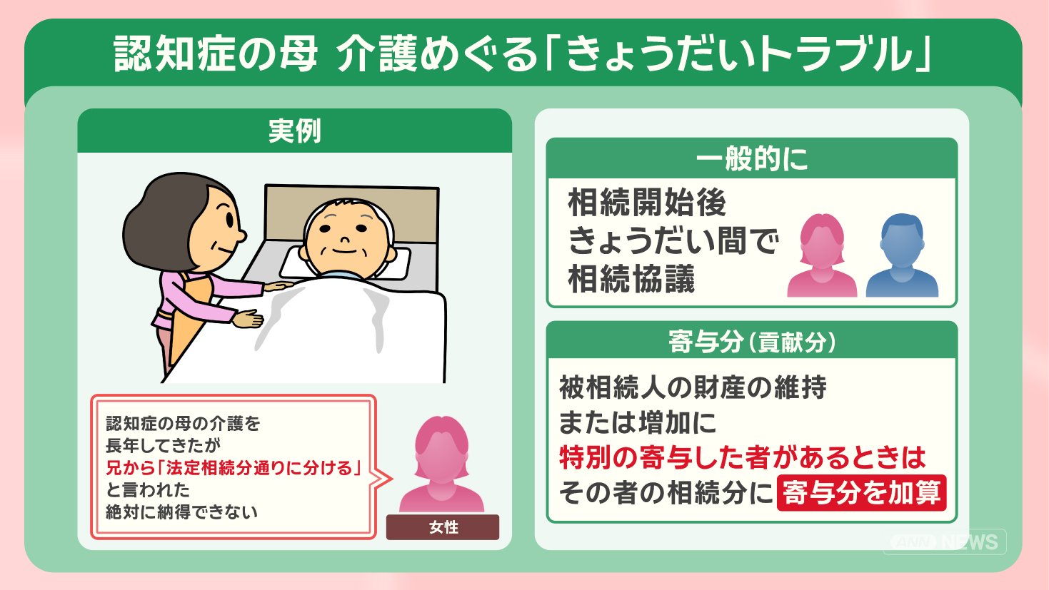 「日常生活もままならない、認知症の母の介護を長年してきたが、兄から『遺産は法定相続分通りに分ける』と言われた。絶対に納得できない」と主張します。