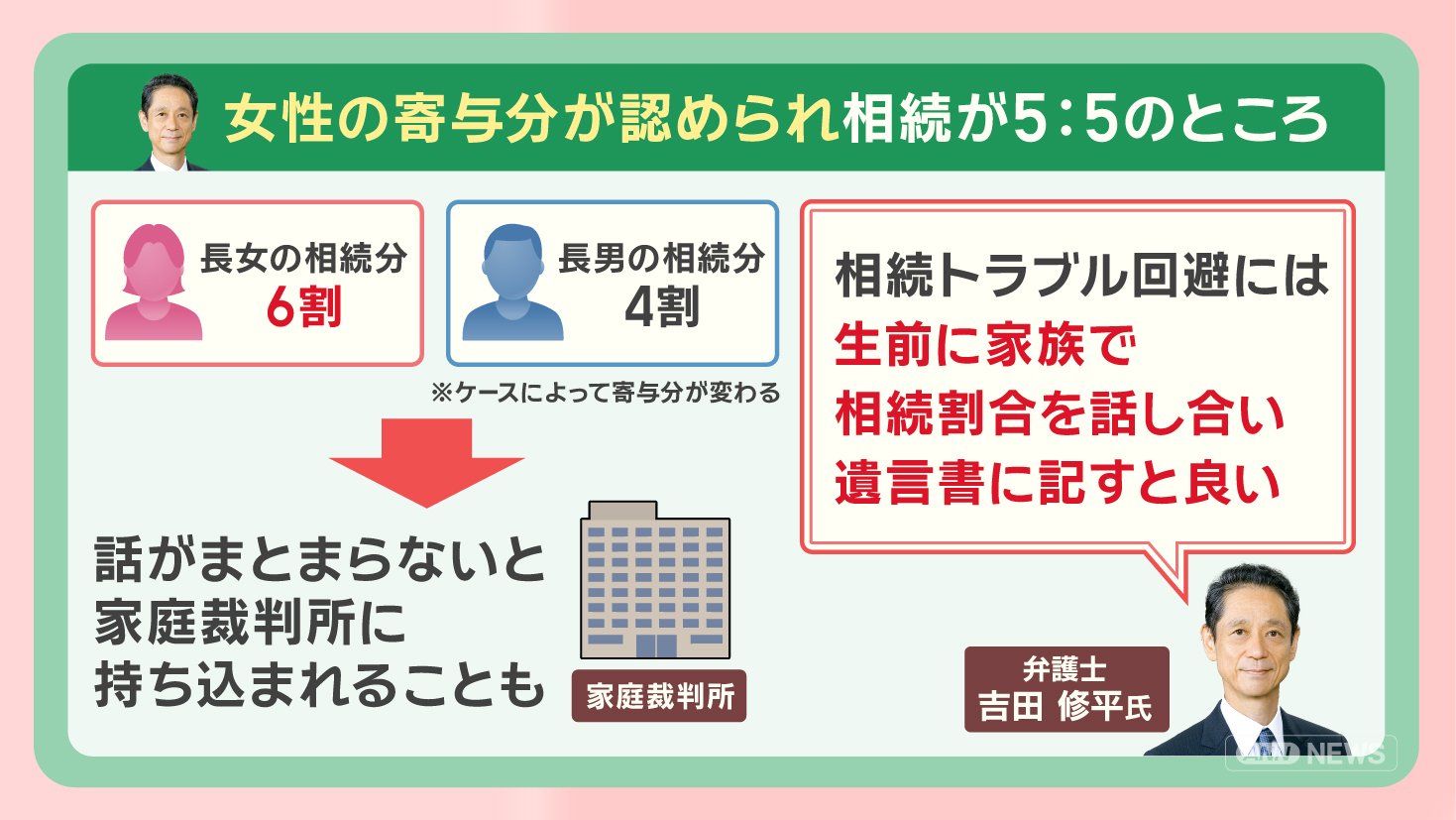吉田弁護士が担当したケースでは、女性の寄与分が認められ、それぞれ相続が5:5となるところ、長女の相続分は6割、長男の相続分は4割となりました。