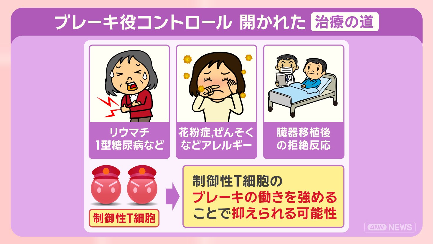 リウマチ、1型糖尿病、花粉症・ぜんそくなどのアレルギー、臓器移植後の拒絶反応などを、制御性T細胞が持つブレーキの働きを強めることで、抑えられる可能性があります。