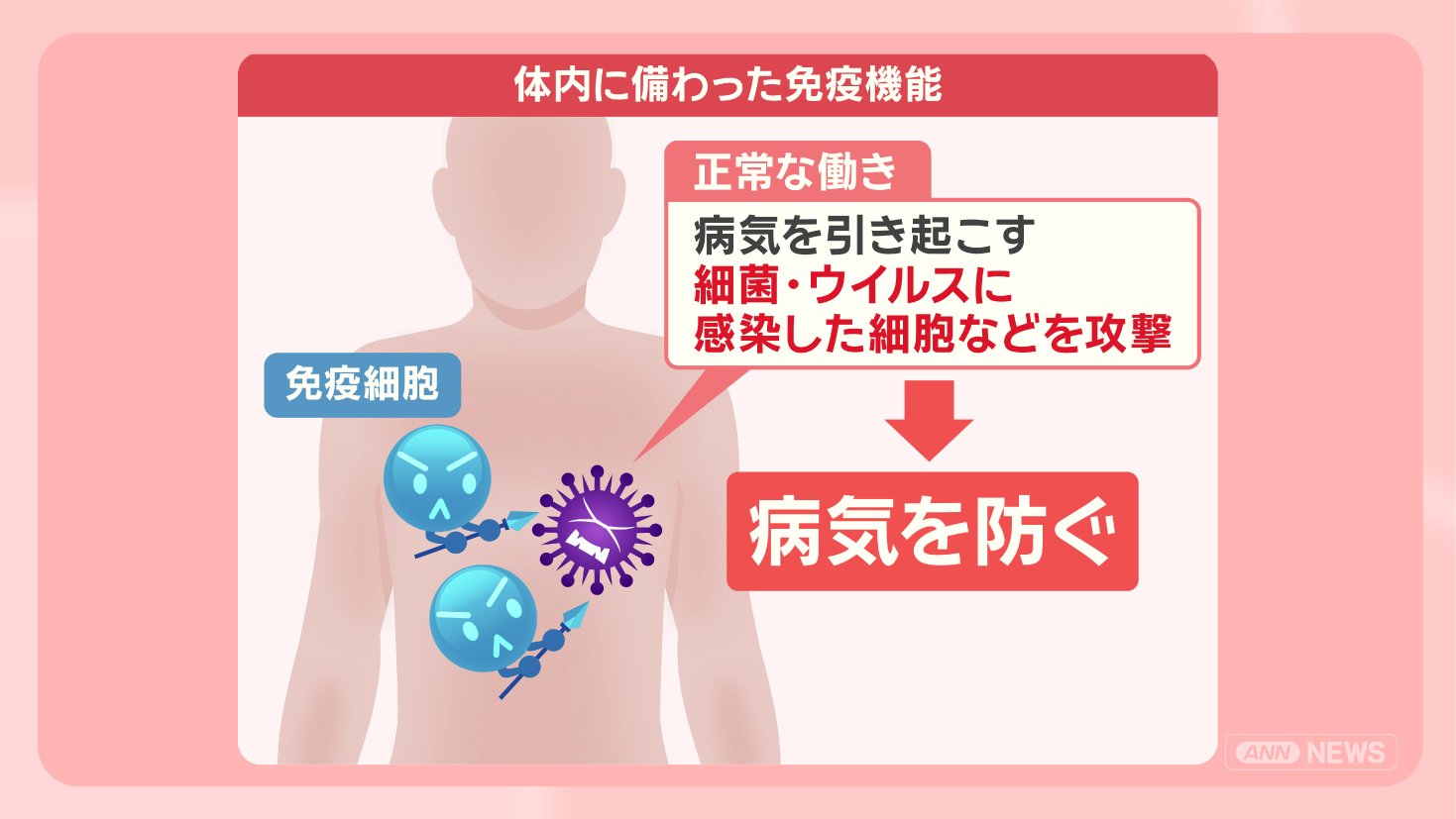 体内の免疫細胞が正常な働きをしている場合は、病気を引き起こす細菌やウイルスに感染した細胞などを、免疫細胞が攻撃し病気を防ぎます。