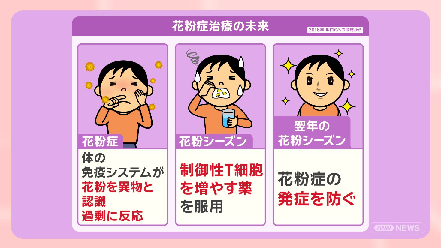そこで、花粉のシーズンに『制御性T細胞』を増やす薬を服用すると、翌年の花粉シーズンに、花粉の発症を防ぐ効果が期待できるということです。