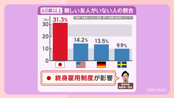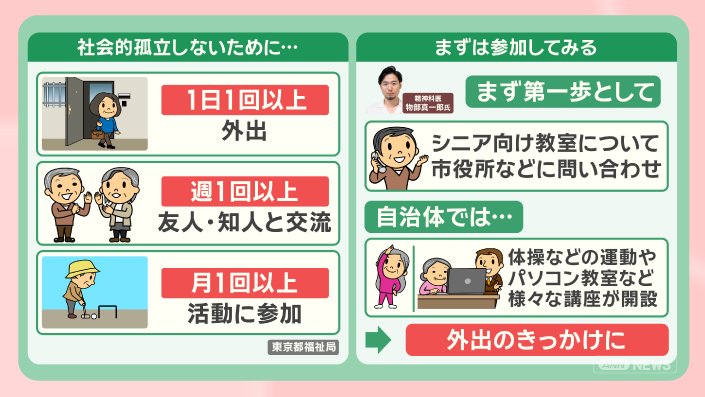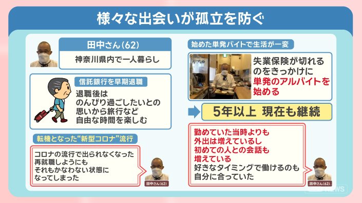 孤立を防ぐために必要なのは、様々な『人とのつながり』です。 神奈川県内で一人暮らしをしている田中さん、62歳です。 田中さんは、信託銀行に勤めていましたが、早期退職を選択。 退職後はのんびり過ごしたいとの思いから、旅行など自由な時間を楽しんでいました。