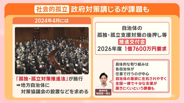 さらに、内閣府は、自治体の孤独・孤立支援対策の後押し等を行うための『推進交付金』について、2026年度に1億7600万円の予算を要求しています。