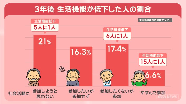 東京都健康長寿医療センターのデータによると、社会活動に「参加しようと思わない(参加しなかった)」人で、3年後に生活機能が低下した人の割合は、21%(約5人に1人)でした。