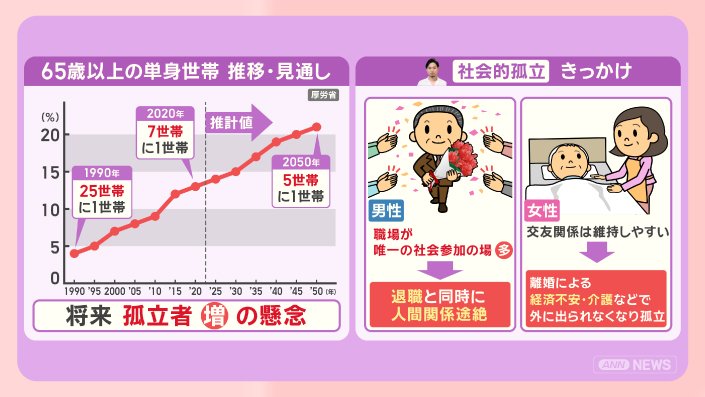 1990年、25世帯に1世帯だった高齢者の一人暮らしは、2020年、7世帯に1世帯になりました。