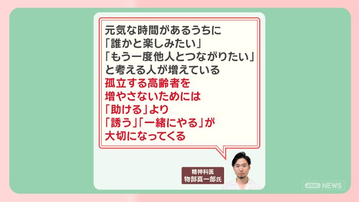 「元気な時間があるうちに、『誰かと楽しみたい』『もう一度他人とつながりたい』と考える人が増えている。孤立する高齢者を増やさないためには、『助ける』より、『誘う』『一緒にやる』が大切になってくる」