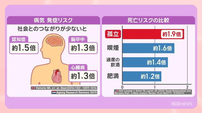 社会的孤立が、病気の発症や死亡リスクを高めるというデータがあります。