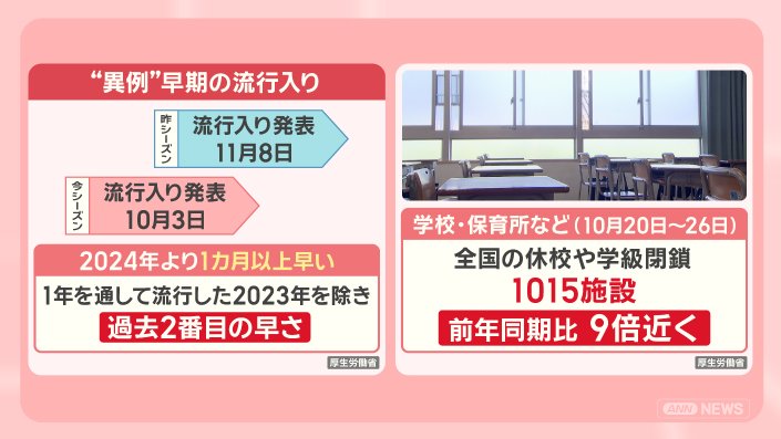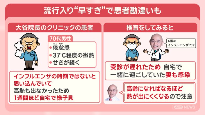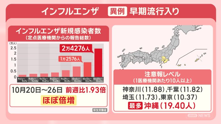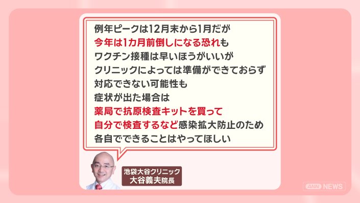 「例年ピークは、12月末から1月だが、今年は1カ月前倒しになる恐れも。ワクチン接種は早いほうがいいが、クリニックによっては準備ができておらず、対応できない可能性も。症状が出た場合は、薬局で抗原検査キットを買って自分で検査するなど、感染拡大防止のため、各自でできることはやってほしい」