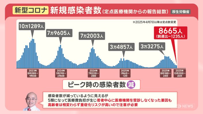 新型コロナの新規感染者数は、10月20日〜26日の1週間で、8665人、前週比で1235人減っています。