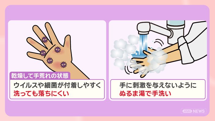 対策として、手に刺激を与えないように、ぬるま湯で手洗いをします。