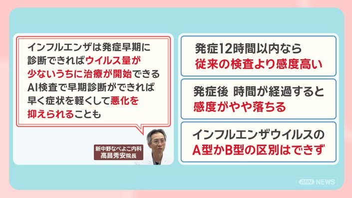 「インフルエンザは、発症早期に診断できれば、ウイルス量が少ないうちに治療が開始できる。AI検査で早期診断ができれば、早く症状を軽くして、悪化を抑えられることも」と話しています。