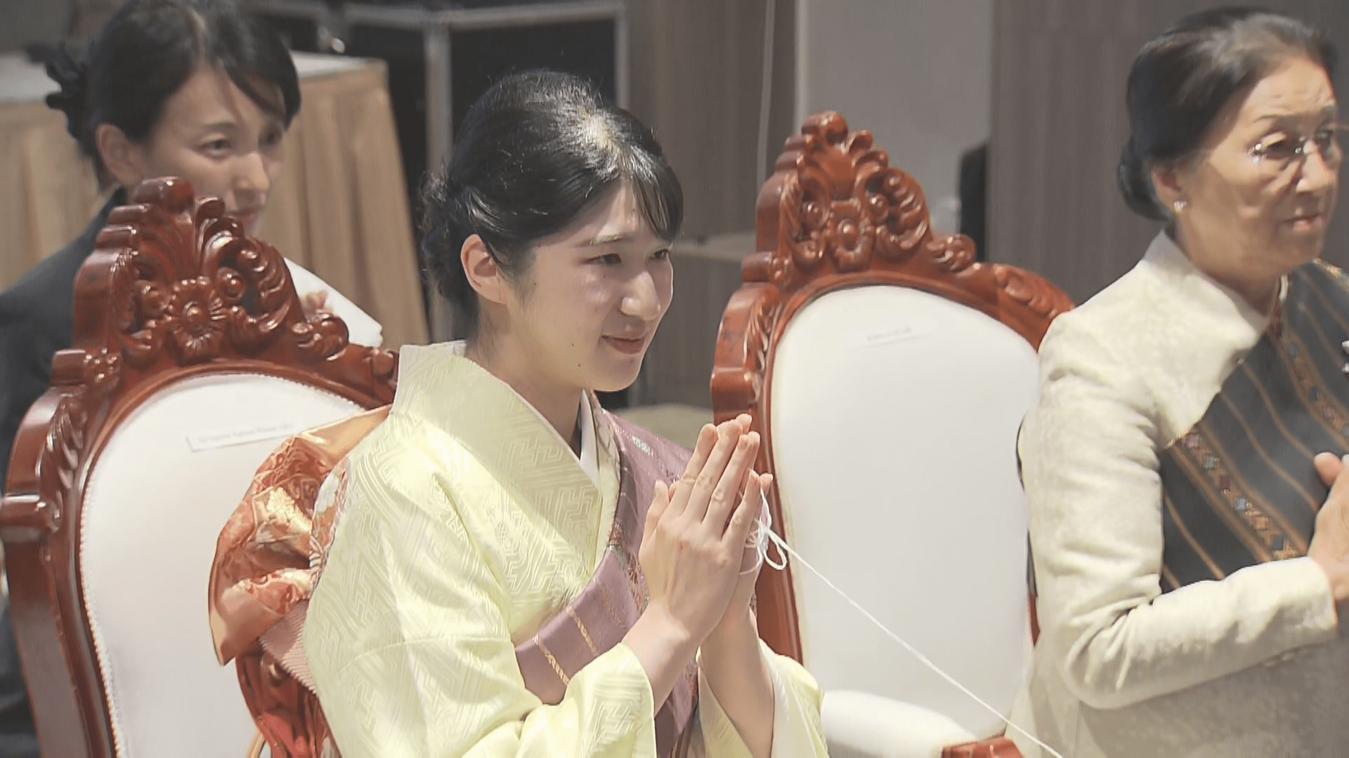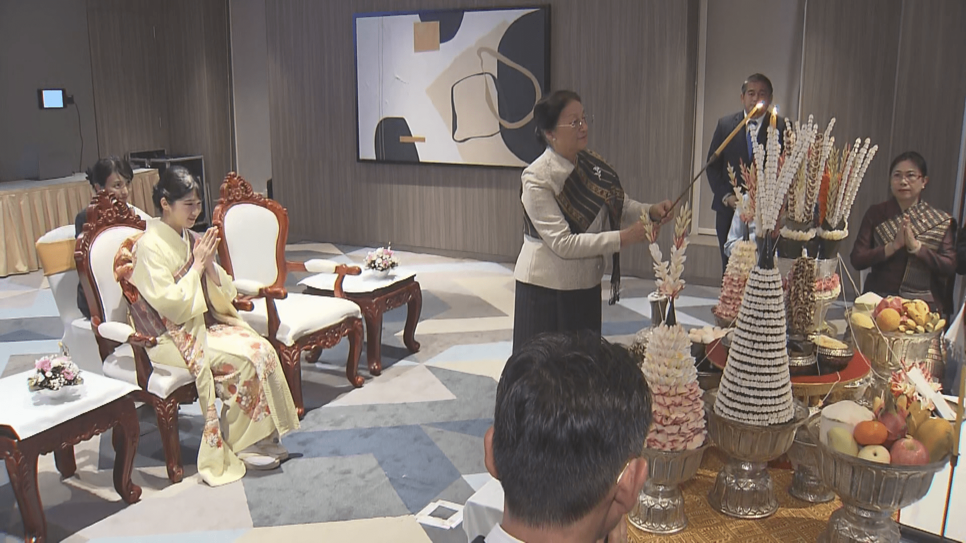 日本時間午後9時ごろ、晩餐会に先立って行われたイベントで、黄色い着物にラオスの民族衣装である肩掛けをまとった愛子さま。