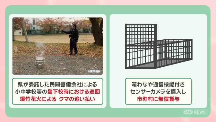 他にも、県が委託した民間警備会社による、小中学校等の登下校時における巡回や、クマが潜んでいる可能性がある近辺で、爆竹花火によるクマの追い払いを行っています。